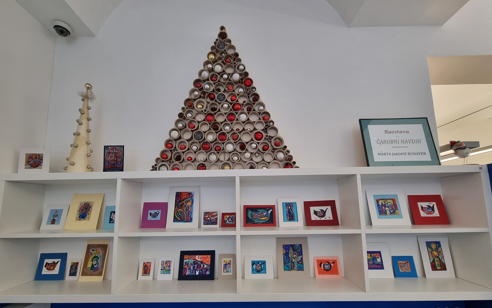 V prazničnem decembru v naši knjižnici gostimo razstavo priznane in poznane umetnice, slikarke MARTE JAKOPIČ KUNAVER. Čarobni navdih v njenih živopisnih pravljičnih miniaturah nas z vso radostjo barv in prizorov vodi v skrivnosti čas božičnih in novoletnih praznikov. Novoletno jelko pa smo iz večinoma reciklažnih materialov ustvarile knjižničarke.