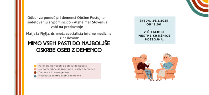 Predavanje organizira Odbor za pomoč pri demenci Občine Postojna v sodelovanju s Spominčico – Alzheimer Slovenija.