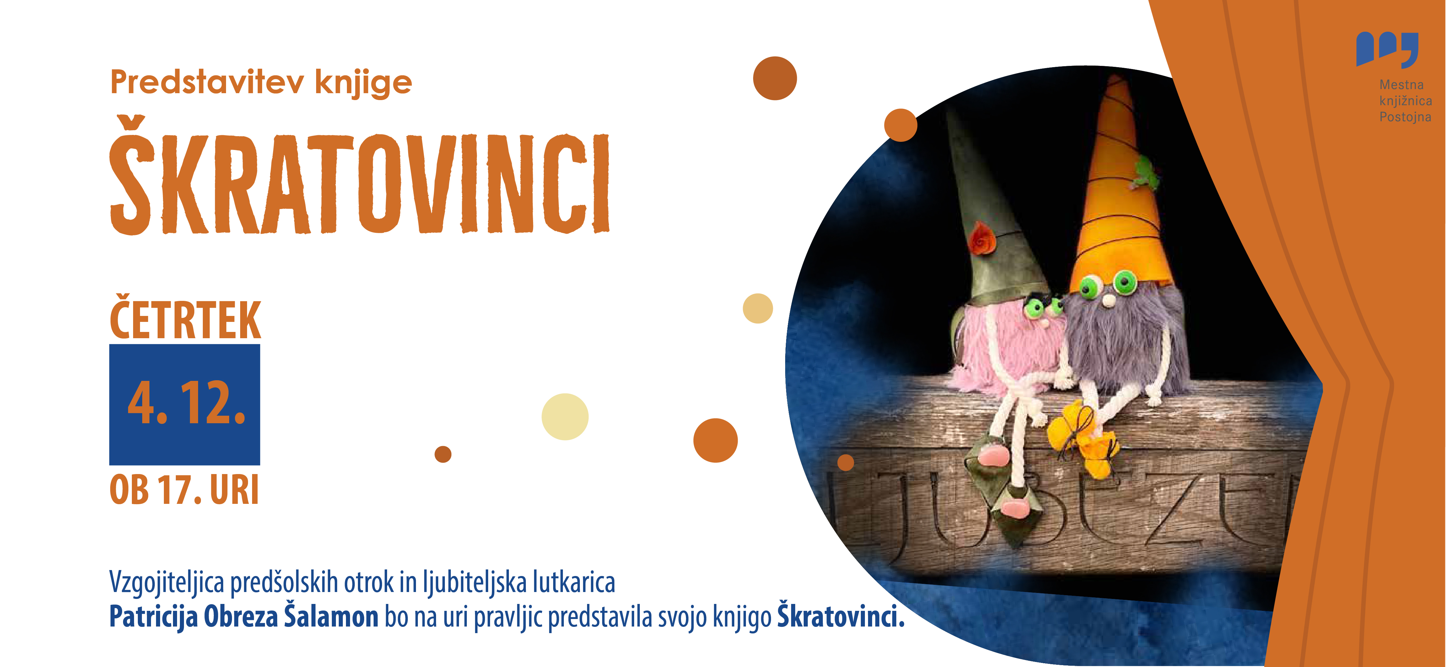 V četrtek, 4. 12. vas ob 17. uri vabimo na pravljično urico, kjer bo gostja Patricija Obreza Šalamon – vzgojiteljica predšolskih otrok in ljubiteljska lutkarica, otrokom (in odraslim) odprla vrata v čarobni svet svoje nove knjigice Škratovinci.